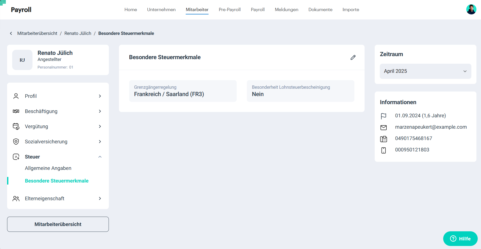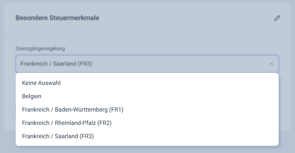 Wählen Sie unter "Grenzgängerregelung" eine der Optionen für Frankreich aus, wird die fiktive Steuerklasse 0 automatisch hinterlegt.