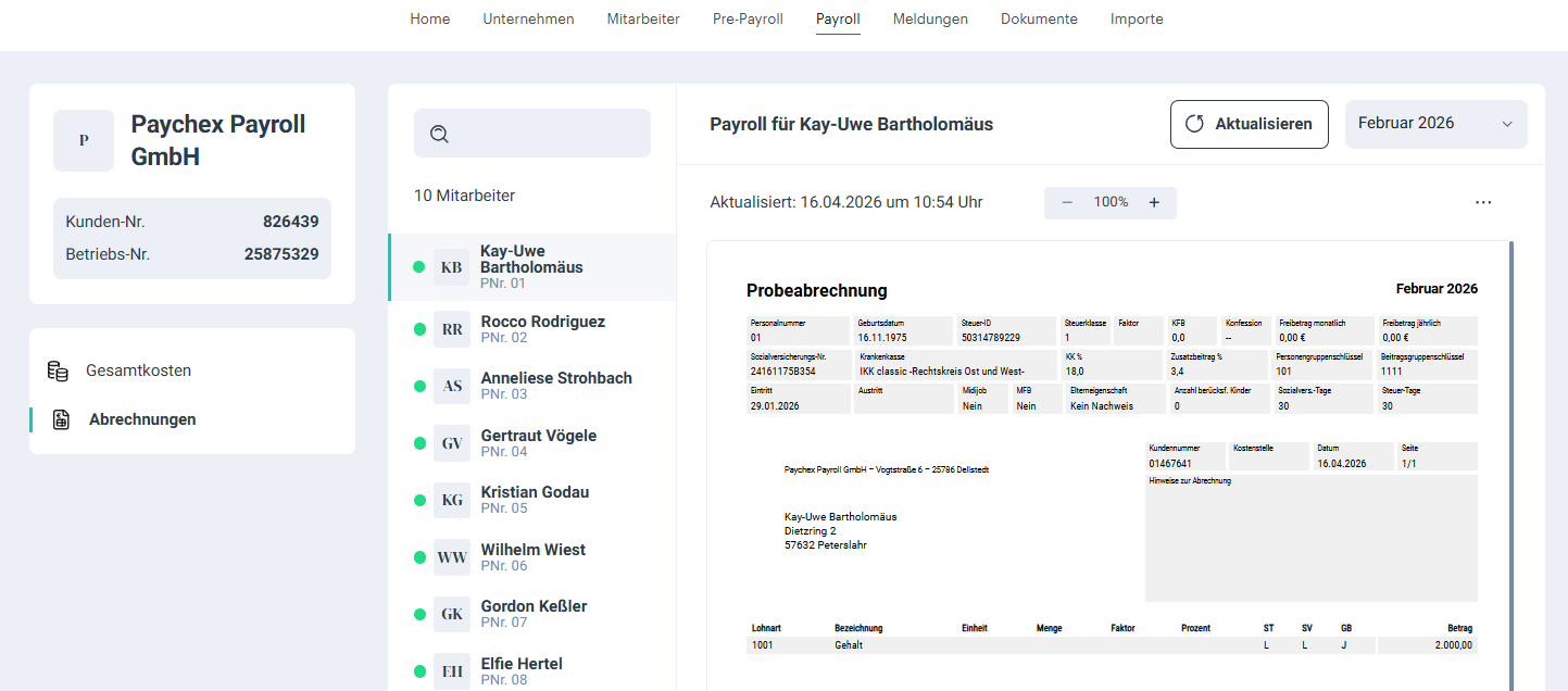 Navigieren Sie sich im Headline-Menü zum Menüpunkt Payroll und dort zum Unterpunkt Abrechnungen.